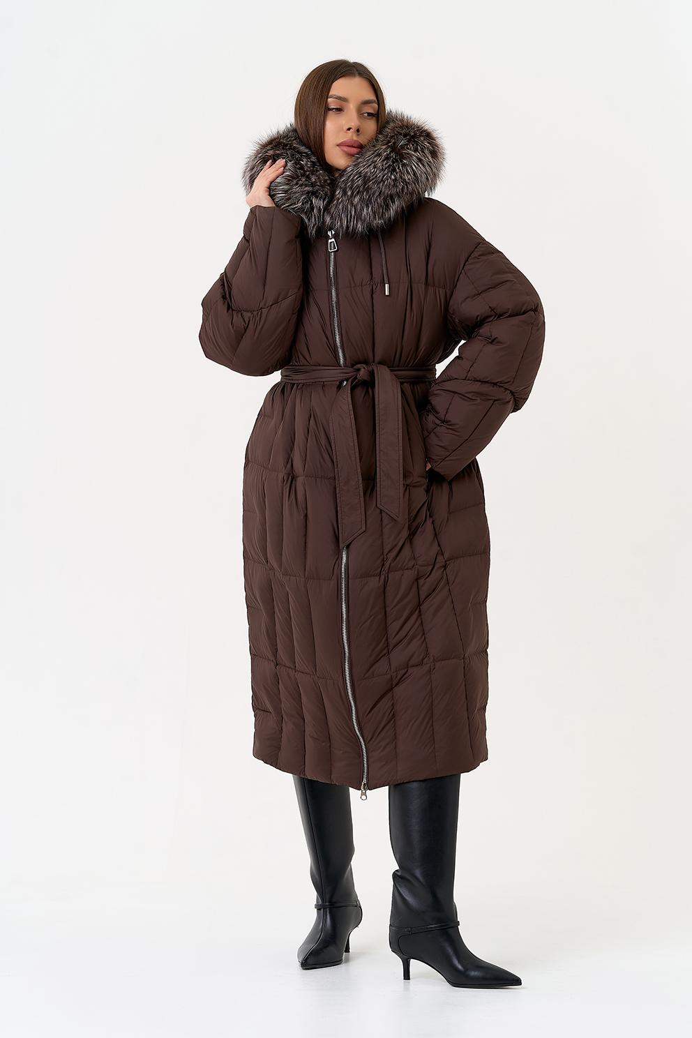 Крой воротника - капюшон, отделка чернобурая лиса