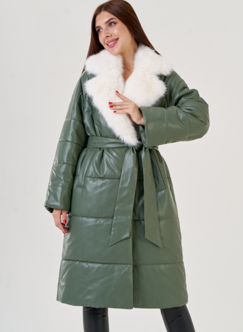 Пуховик в зеленом цвете с воротником из эко меха. Модель выполнена из эко кожи, что позволяет ей быть прочной и эластичной. Меховой воротник отстегивается. Английский ворот подчеркнет вашу шею. По бокам имеются прорезные карманы. В комплекте идет пояс из материала верха.